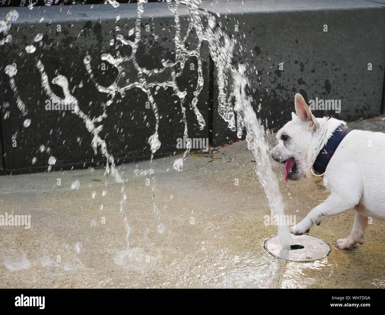 With this, a playful pooch strolls down their local park to play with the water fountains.